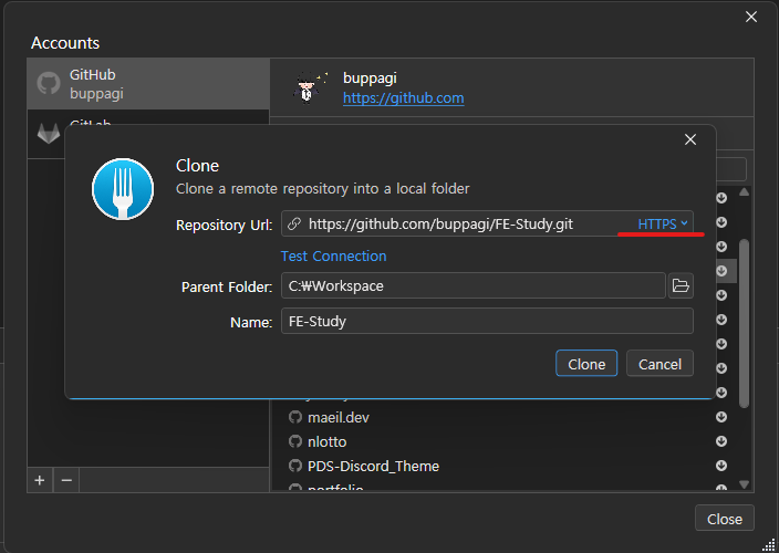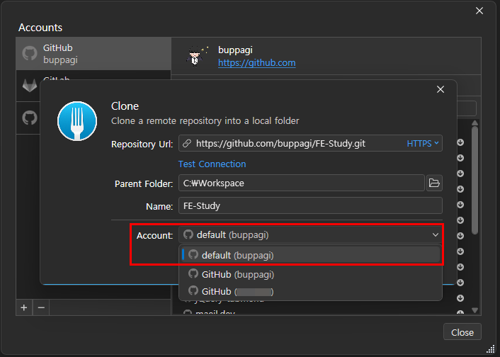 위의 이미지를 보시면 같은 github지만 다른 계정으로 인하여 Account라는 옵션이 추가 되었고 Clone을 하기 전에 해당 계정을 선택을 하게 해줍니다.
