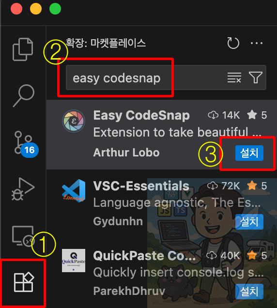① 왼쪽 사이드 익스텐션 클릭 → ② easy codesnap 검색 → ③ 설치 클릭