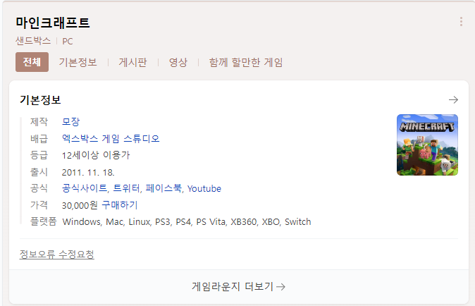 위 갈무리에 보이는 것처럼 네이버 검색창에 ‘마인크래프트’를 검색하시면 됩니다.