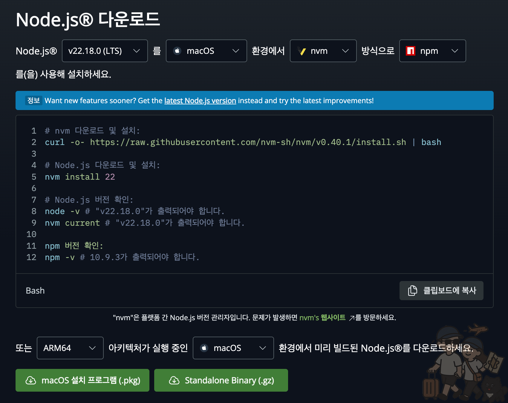💡 팁: Mac 사용자 중 터미널 설치를 선호하는 분들은 brew install node로 설치할 수 있음. (Homebrew 필요)